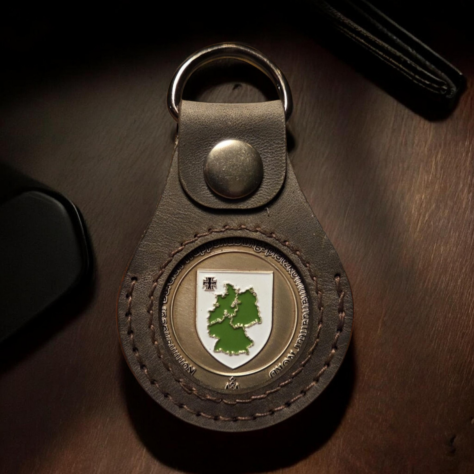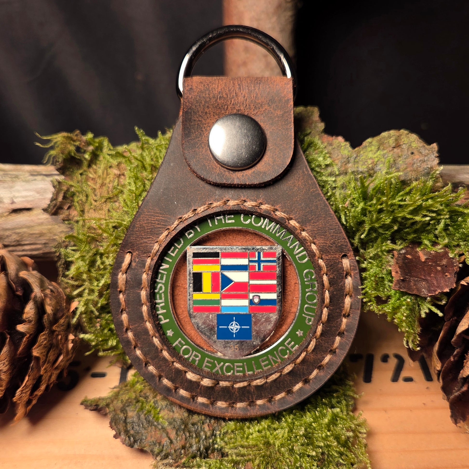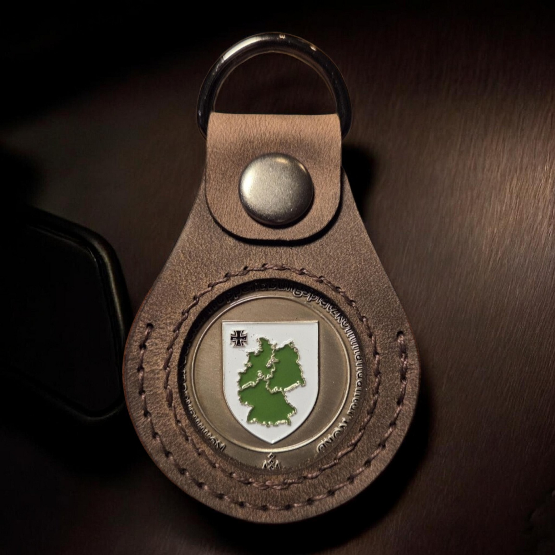 Von Feuerwerker handgefertigtes Anhänger mit Karabiner für einen Challange Coin, eine andere Münze aus hochwertigem Büffelleder.