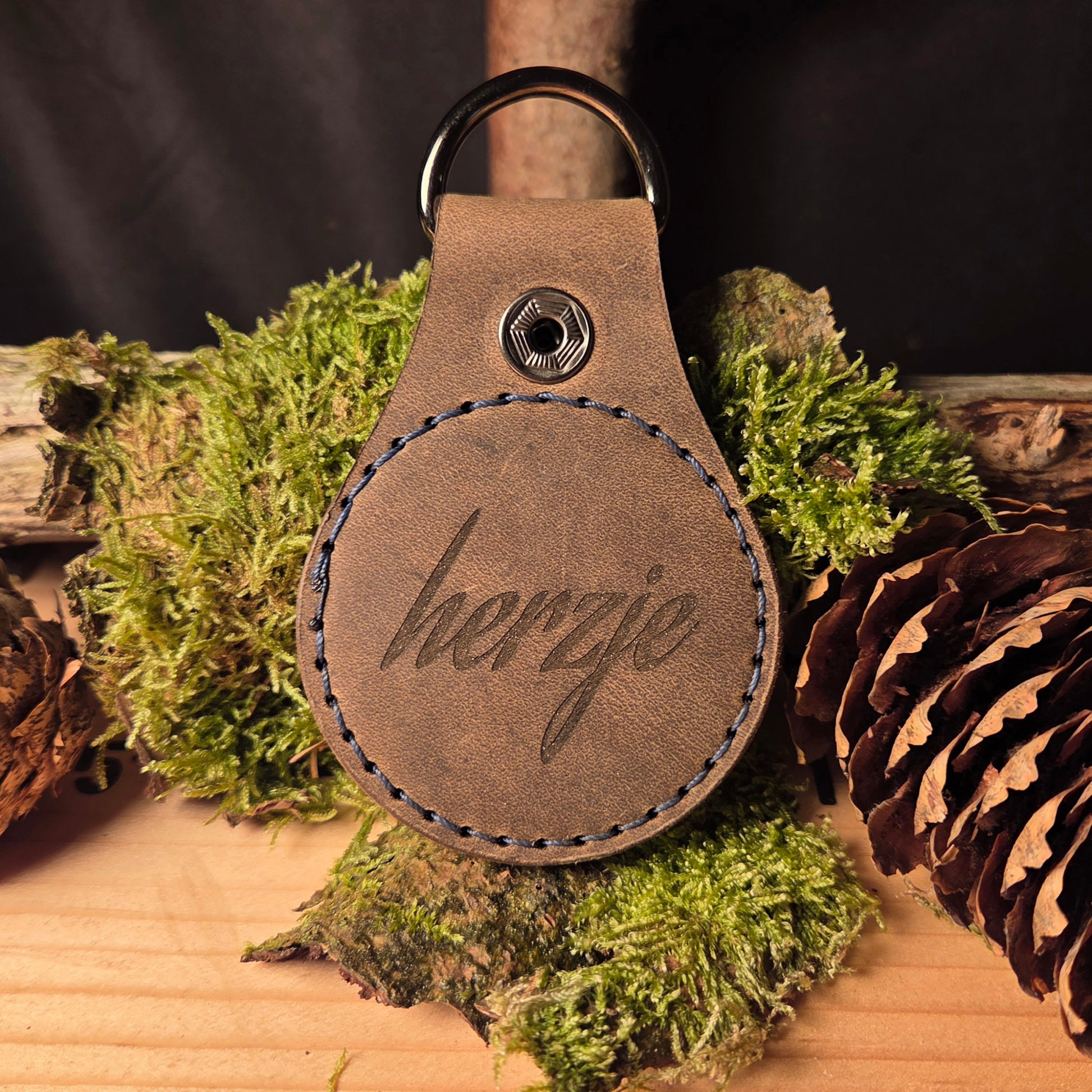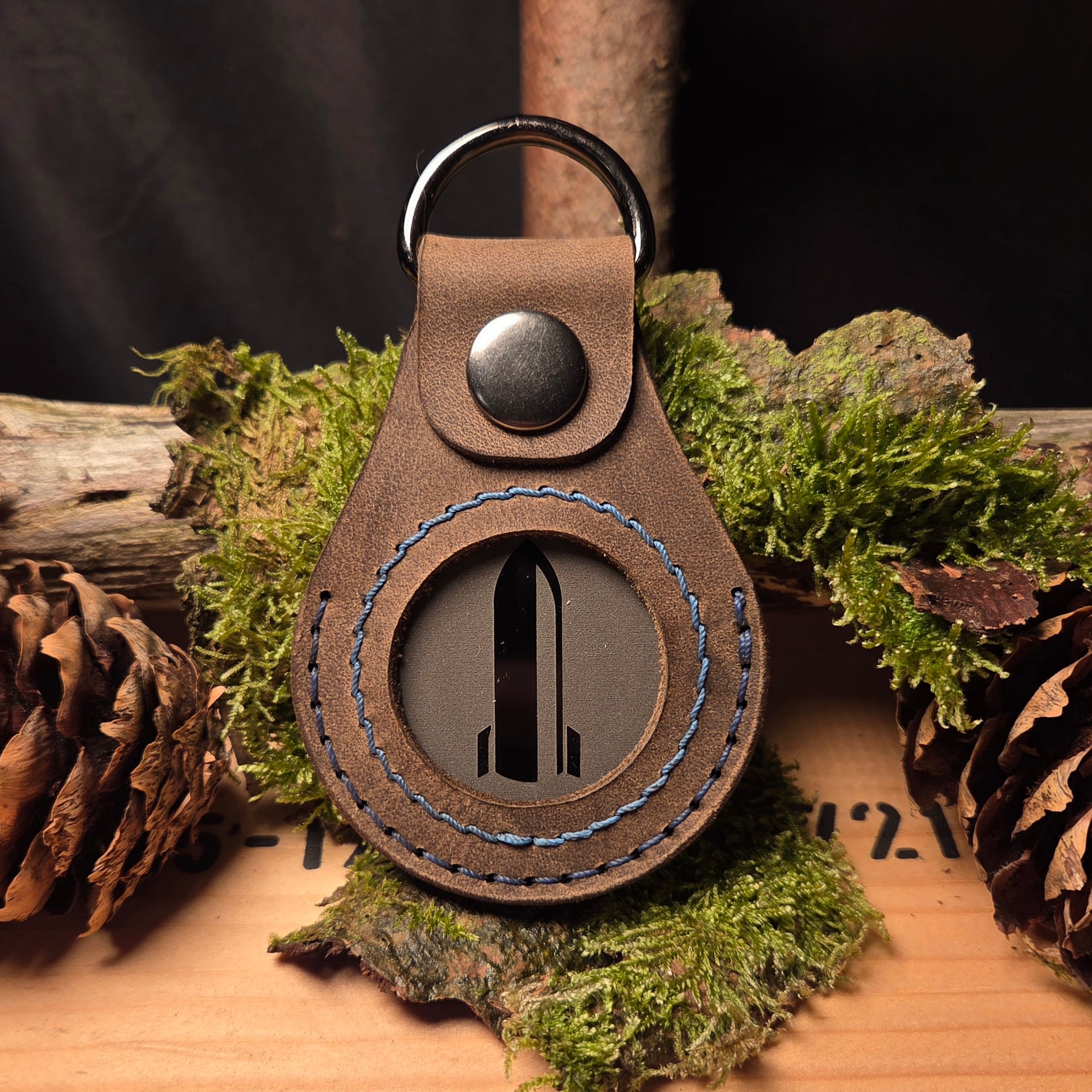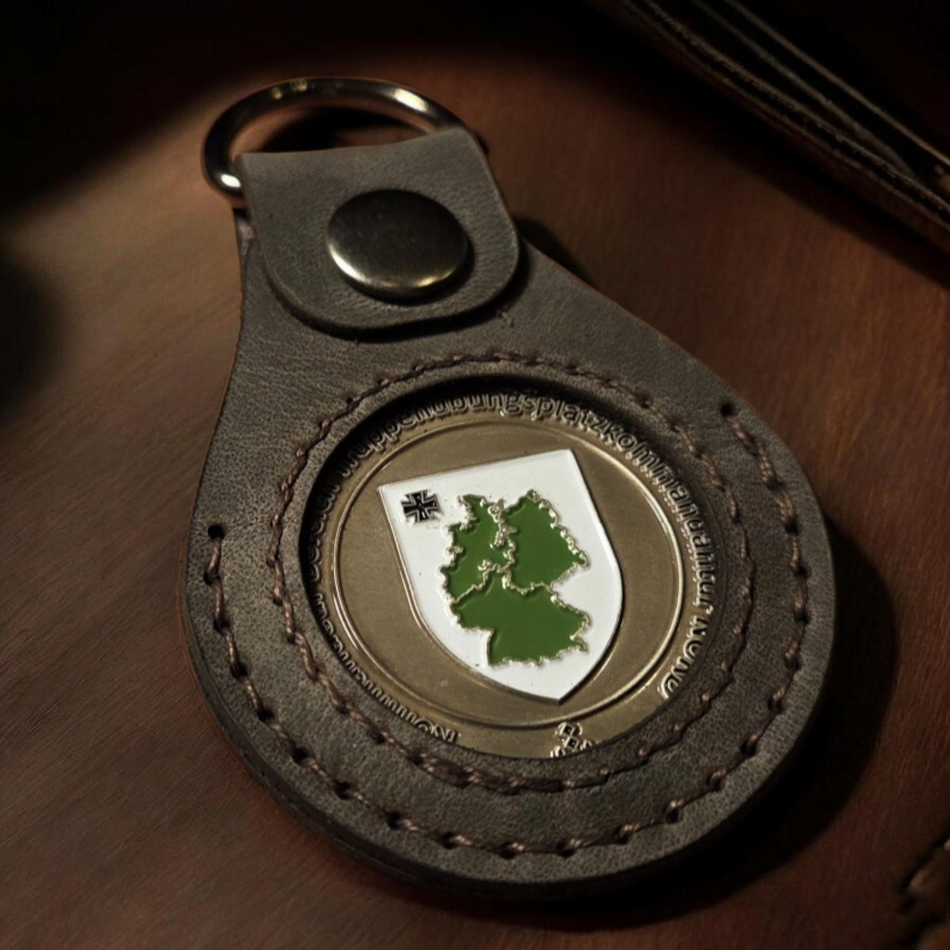 Von Feuerwerker handgefertigtes Anhänger mit Karabiner für einen Challange Coin, eine andere Münze aus hochwertigem Büffelleder.