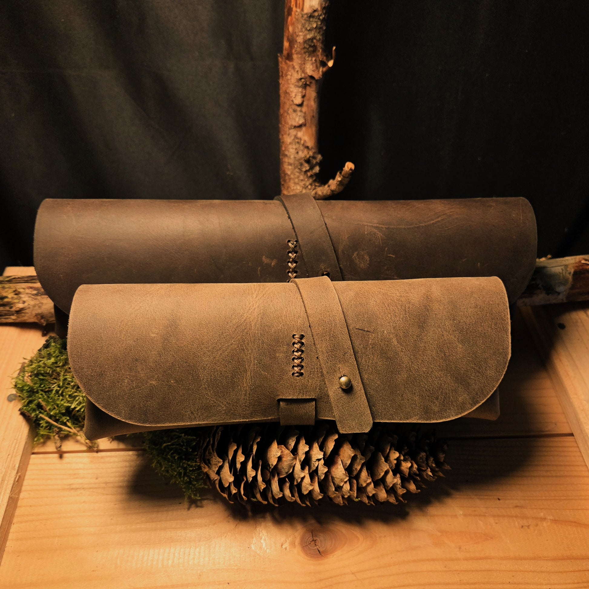 Die aus hochwertigem Leder gefertigten Federmappen mit Knopfnietenverschluss sind in den Ausführungen "Standard" und "Groß" verfügbar. Die Standard Variante ist das klassische Federmäppchen. Das Große hingegen bietet auch Platz für beispielsweise größere unf längere Gegenstände Pinsel.